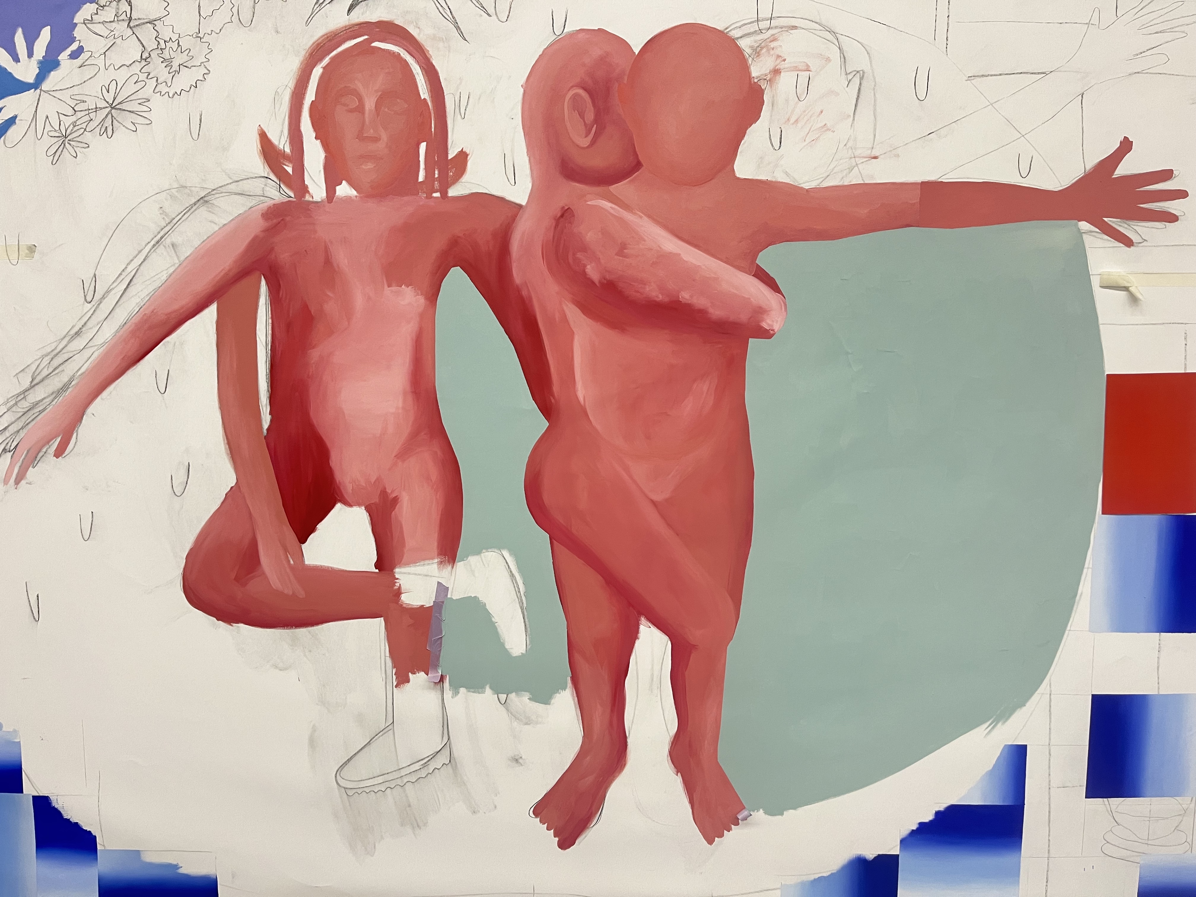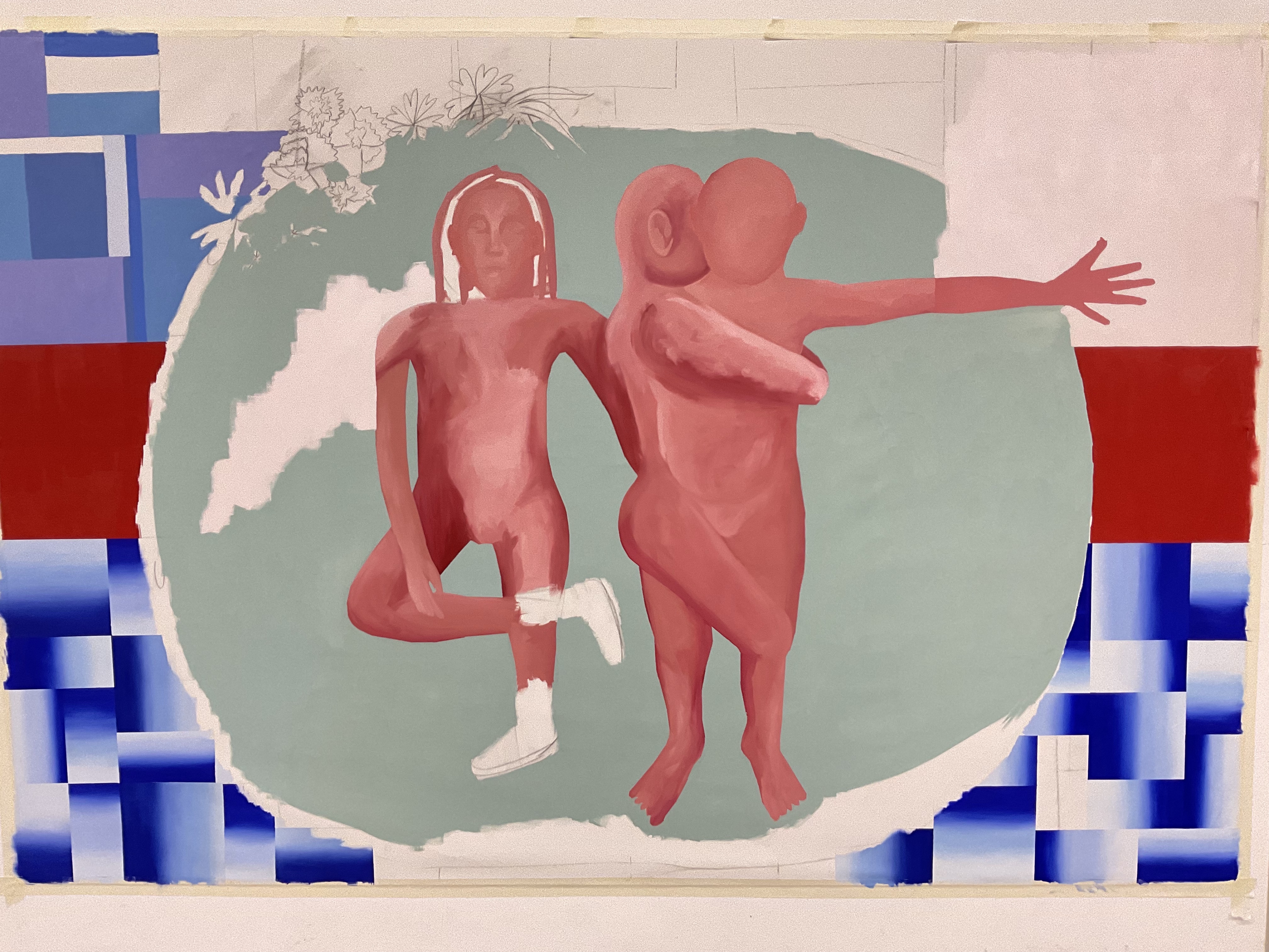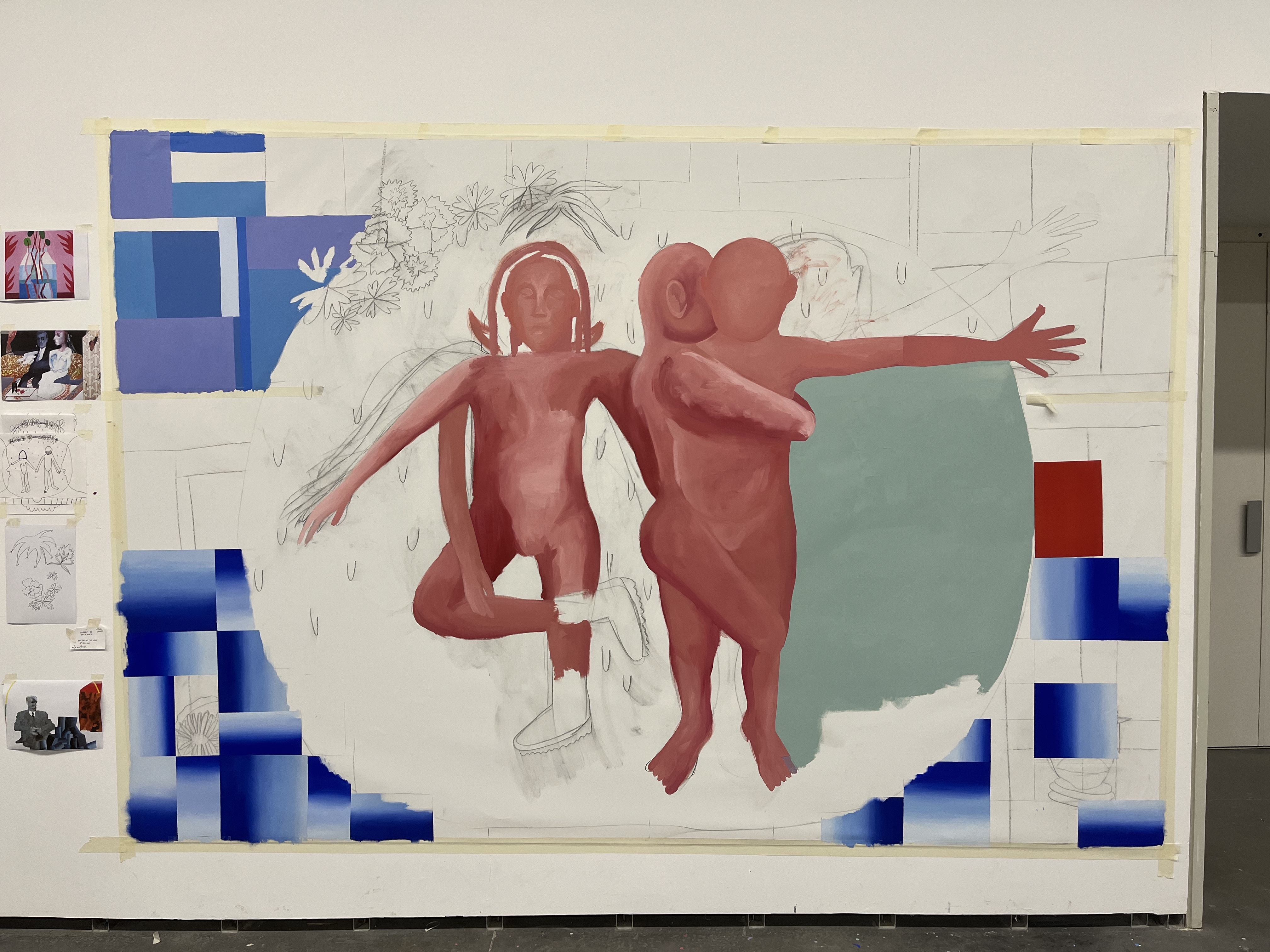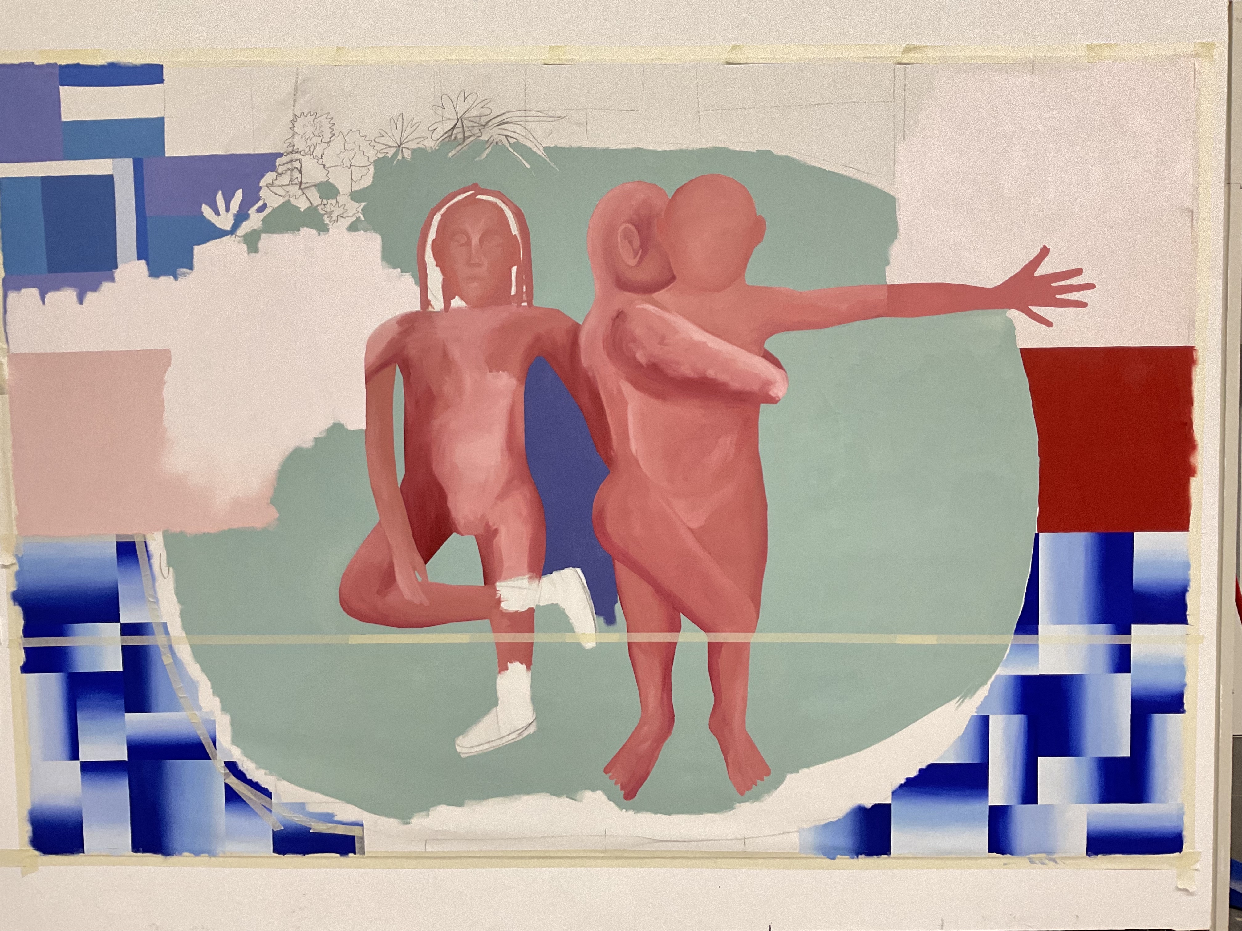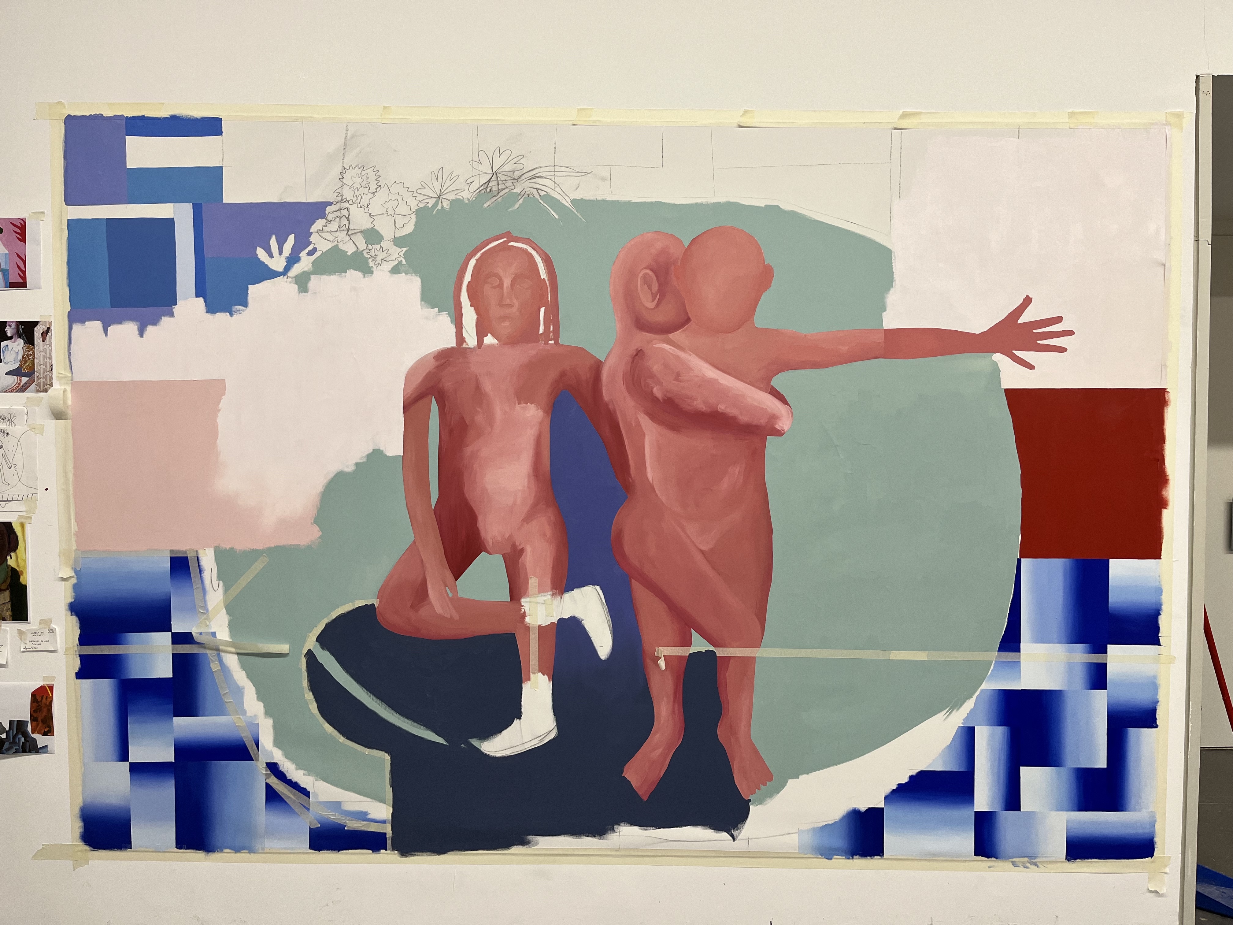 Esta pintura me tiene totalmente noqueada, solo pienso en ella. Claro, es muy grande y cuando pinto no consigo verla entera hasta que me alejo, lo cual aunque parezca un detalle sin importancia, cualquiera que pinte te dirá que es toda una movida. De repente tu cuerpo es más pequeño que la pintura, se abre una ventana enorme frente a ti.